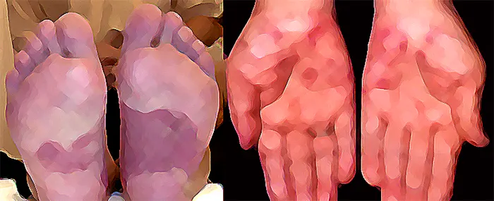 손바닥이나 발바닥 외에 무릎, 정강이, 팔꿈치, 머리 등에도 증상이 나타날 수 있다.